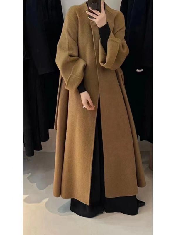 コート レディース 秋冬 ウール ロング丈 ダブルフェイス 無地 丸首 ベルト付き 金キャメル ラテ・・・