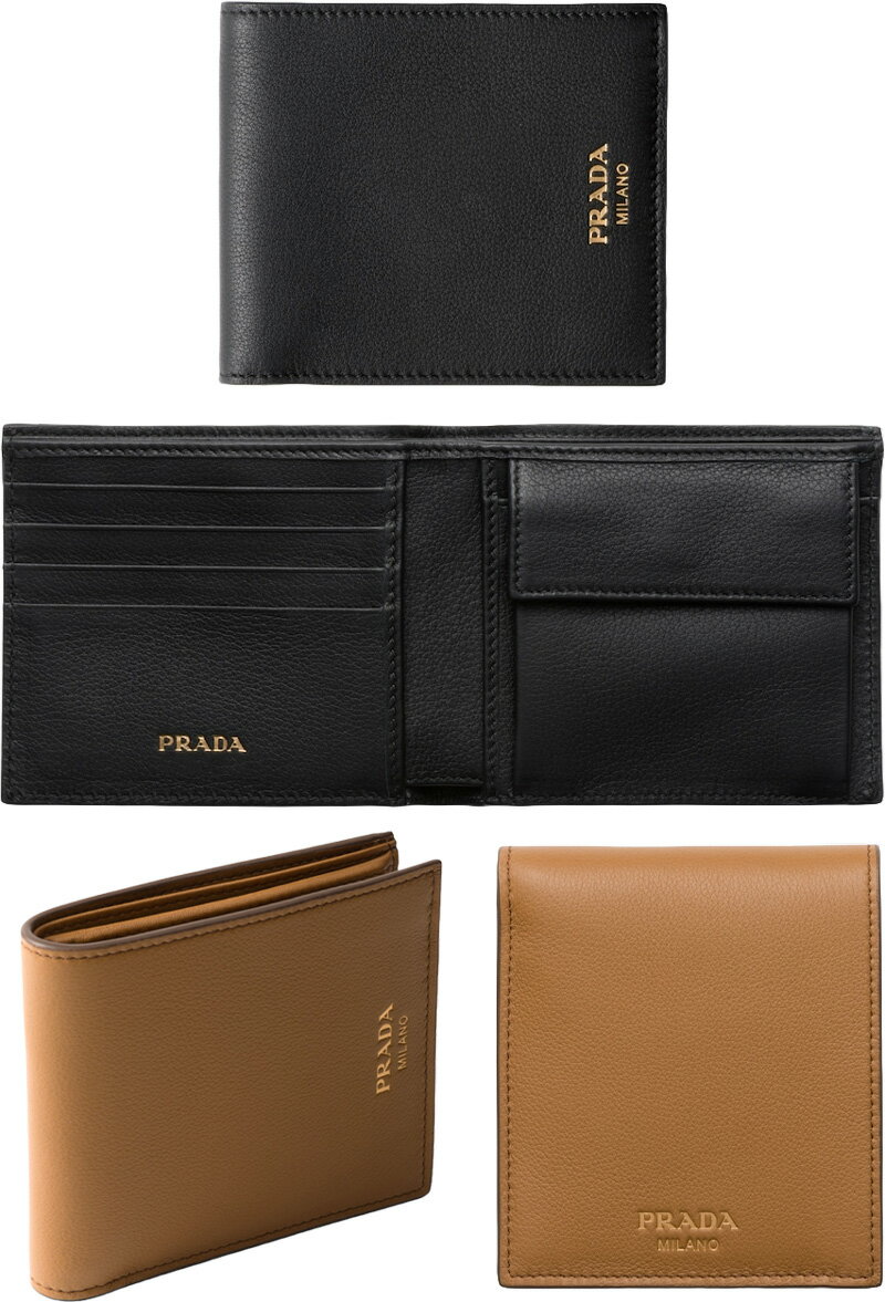 PRADA プラダ メンズ 小銭入れ付き二つ折り財布箔押しロゴ ソフトグレインレザーブラック キャメ・・・