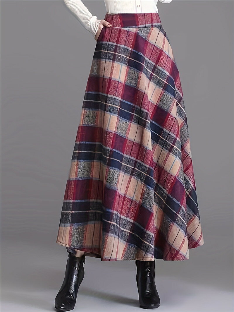 ハイウェスト 暖かい ラシャタッチ フレアスカート マキシスカート 秋冬 ラシャタッチ チェックスカ・・・
