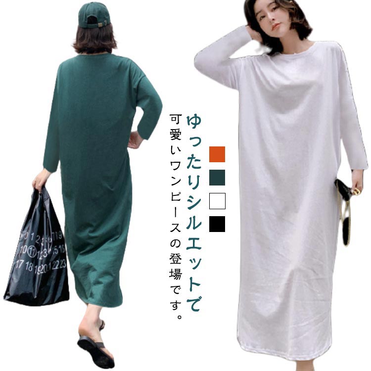 ワンピース レディース クルーネック 長袖 マキシ丈ワンピース スウェットワンピース 無地 シンプル・・・