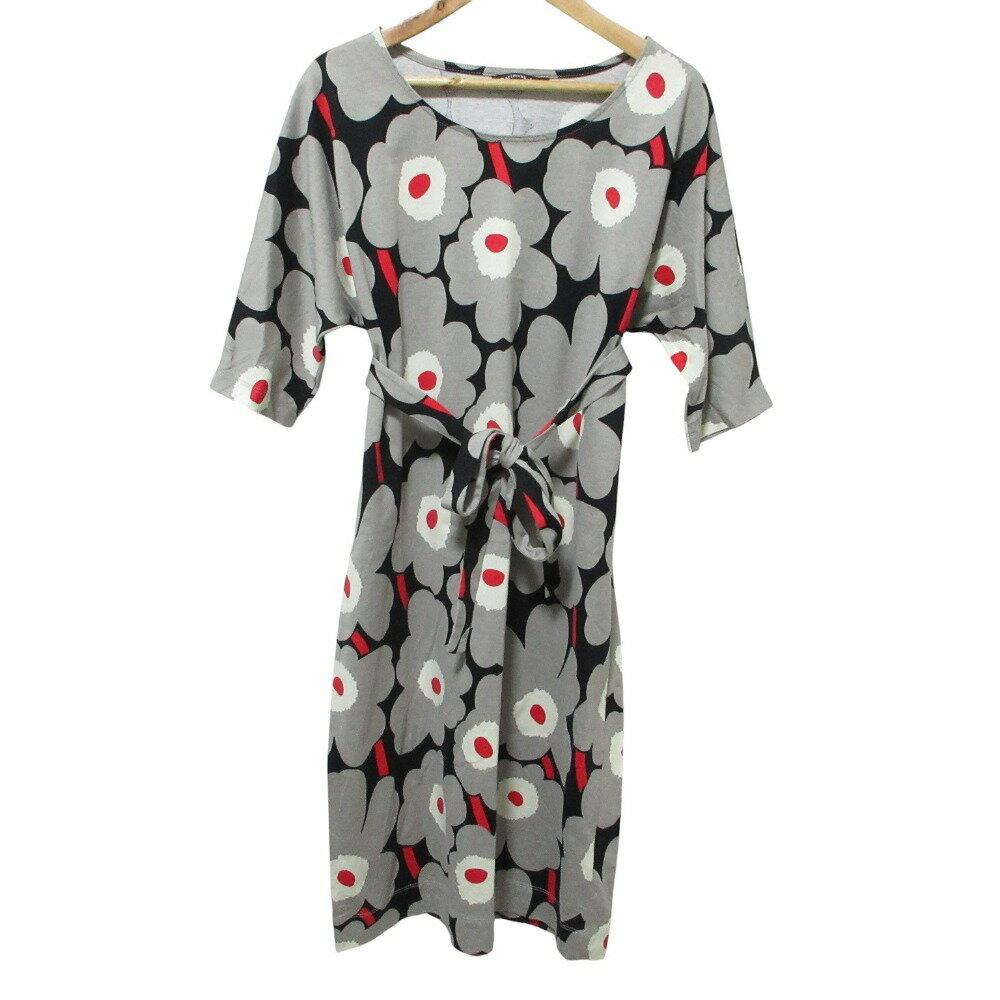 【中古】美品 Marimekko マリメッコ ウニッコ 半袖 膝丈 ベルテッド カットソー ワンピー・・・