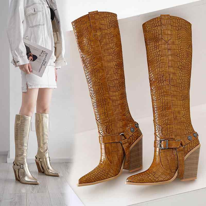 ブーツ レディース 女性用 膝丈 ロングブーツ ポインテッドトゥ 太ヒール ハイヒール 黒 無地 刺・・・