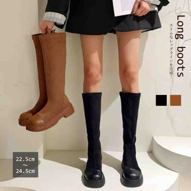 ロングブーツ ラウンドトゥ 厚底ブーツ【大きいサイズ レディース 雪道 サイドゴア ヒール ロング ・・・