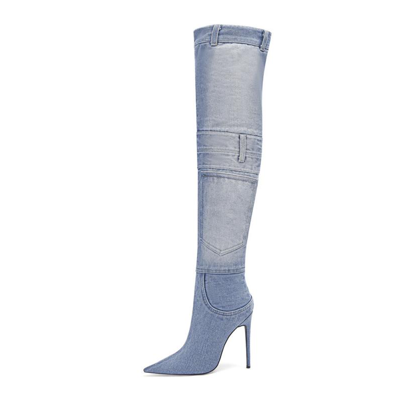 デニムブーツ レディース ウォッシュブルー ポインテッドトゥ 8cm超ピンヒール ニーハイ丈 ポケッ・・・