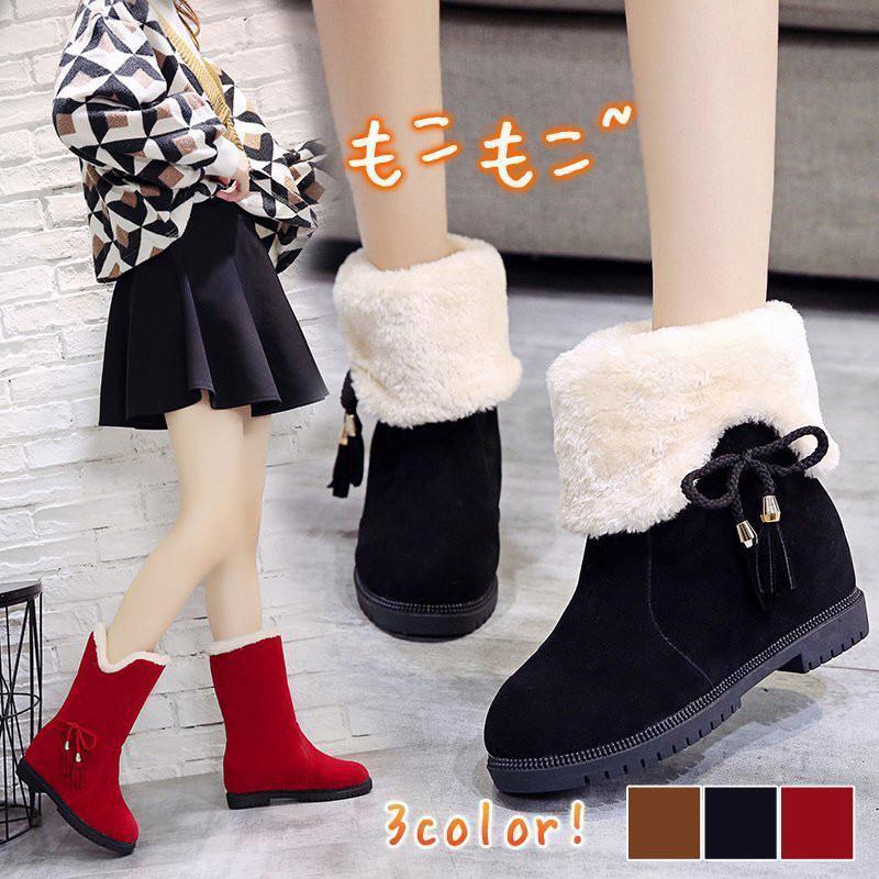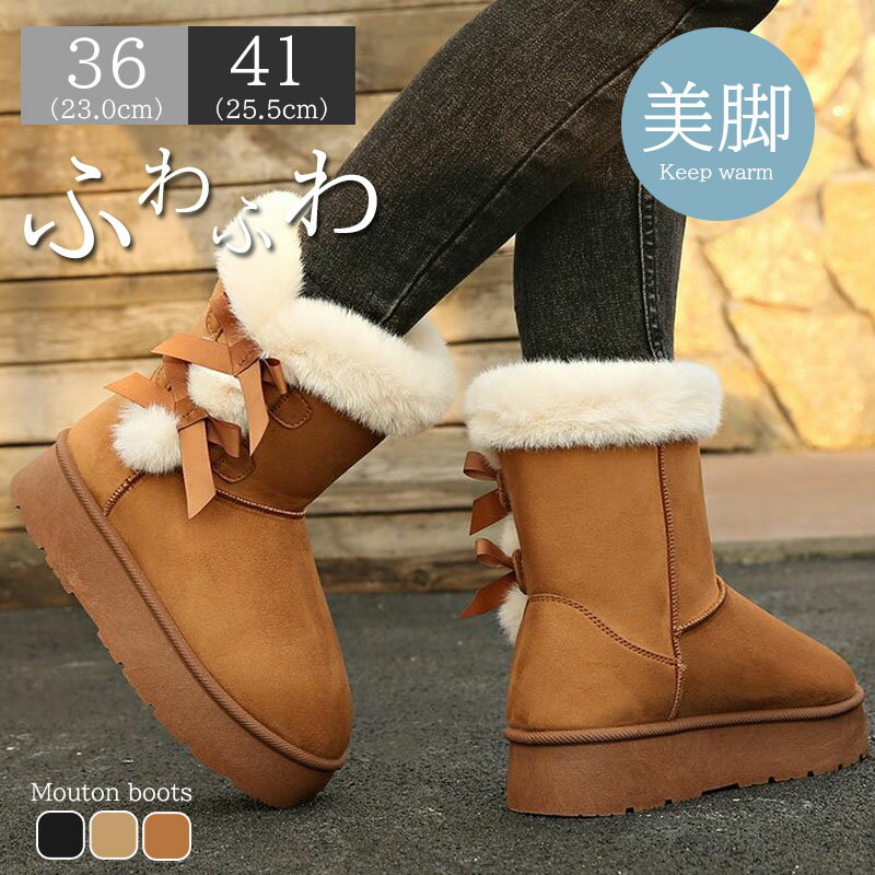 ムートンブーツ レディース 厚底 リボン ミドル丈 ショートブーツ スエード スノーブーツ 防寒ブー・・・