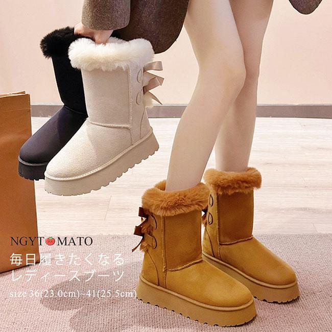 ムートンブーツ 厚底 レディース フェイクファー ミドル丈 リボン付き スノーブーツ 裏ボア 防寒ブ・・・