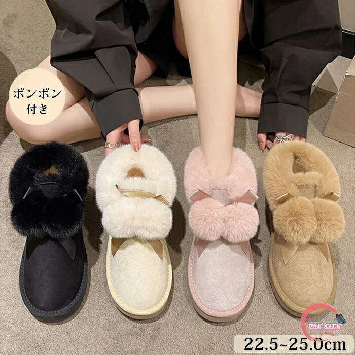 ムートンブーツ ボアブーツ レディース もこもこ ポンポン付き リボン 防寒 保温 フラットヒール ・・・