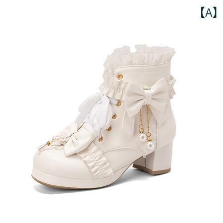 レディース ショートブーツ ロリータ プリンセス かわいい リボン フリル レースアップ 太ヒール ・・・