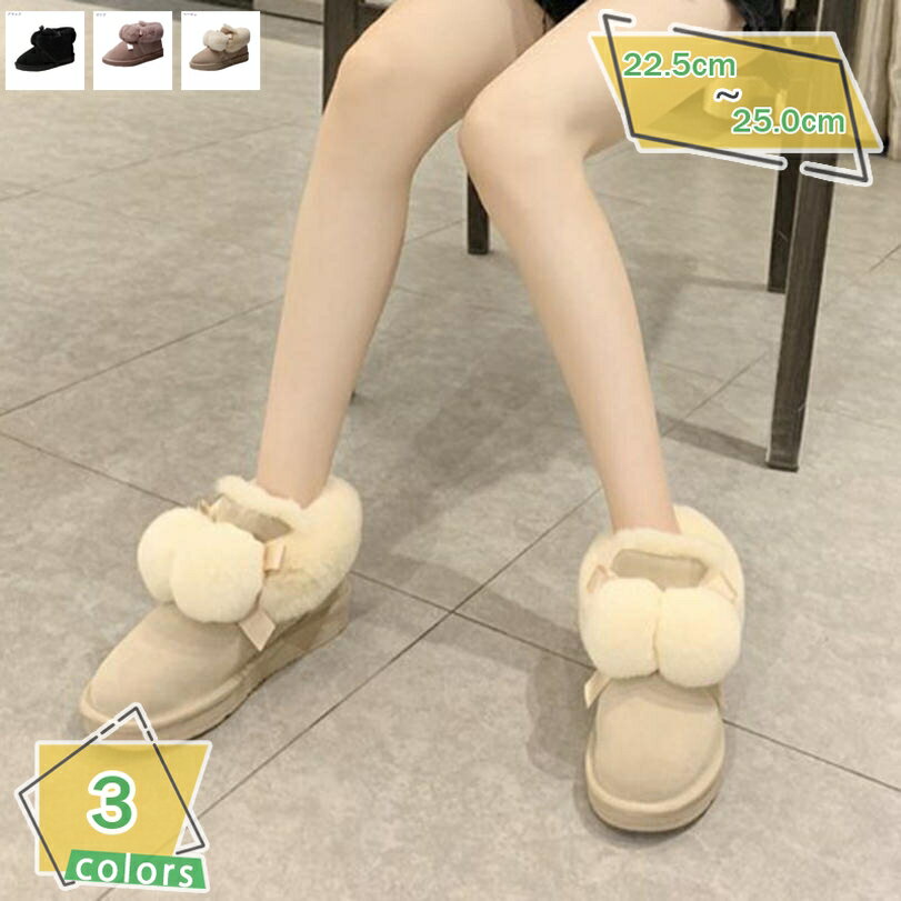 レディース ムートン ブーツ 裏起毛 防寒 ショート 冬 リボン付き ファー飾り 可愛い 黒 超軽量・・・