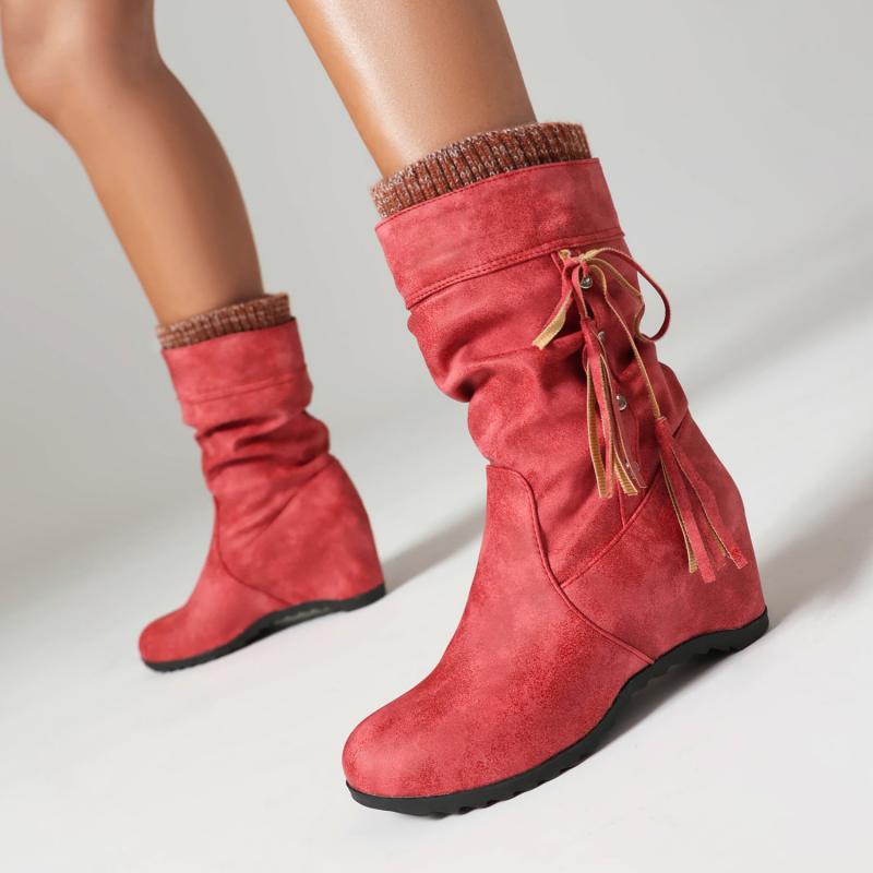 ミドルブーツ レディース 女性用 秋冬 フリンジ リボン インヒール シークレットヒール ニットアッ・・・