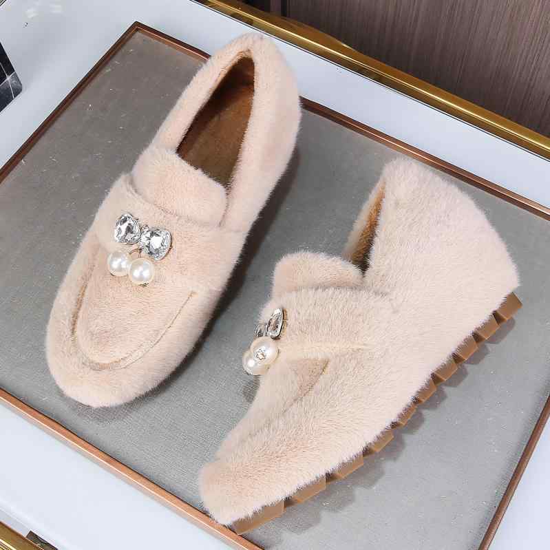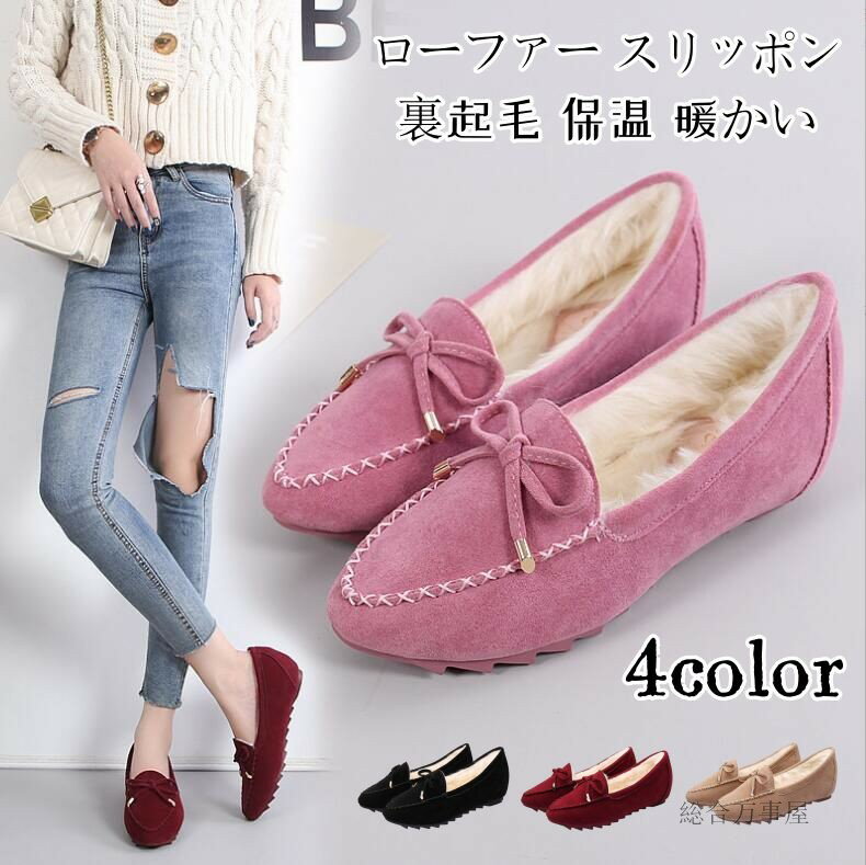 靴 レディース 暖か内ボア豆 婦人用 スリッポン モカシン ラウンドトゥ インヒール 防滑 フェイク・・・