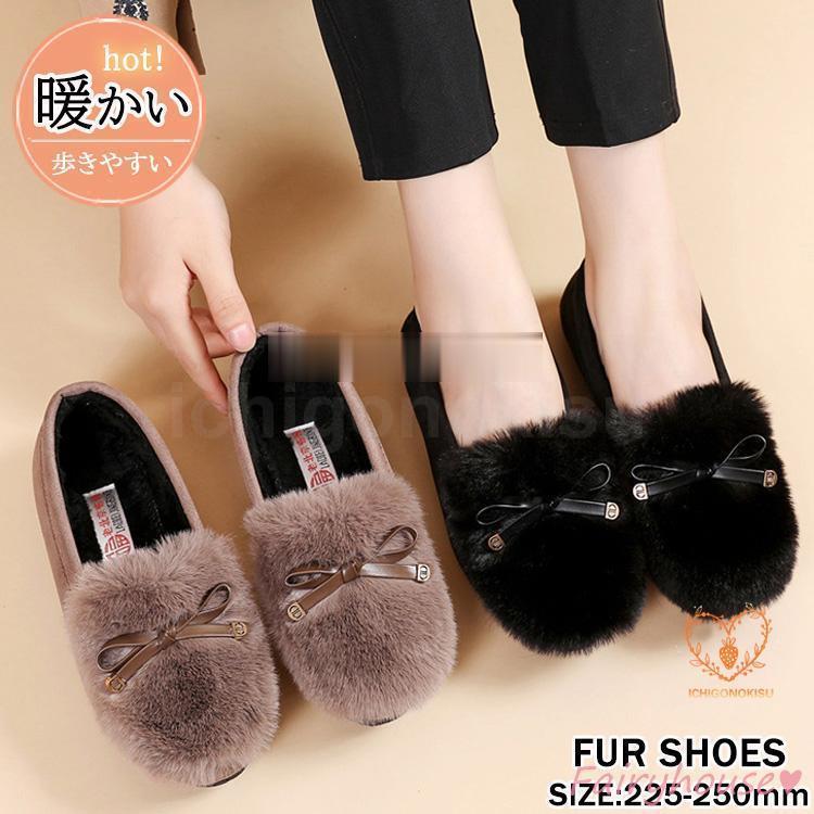 ファーパンプス レディースシューズ 歩きやすい 裏起毛 モカシン エコファーパンプス ぺたんこ スリ・・・