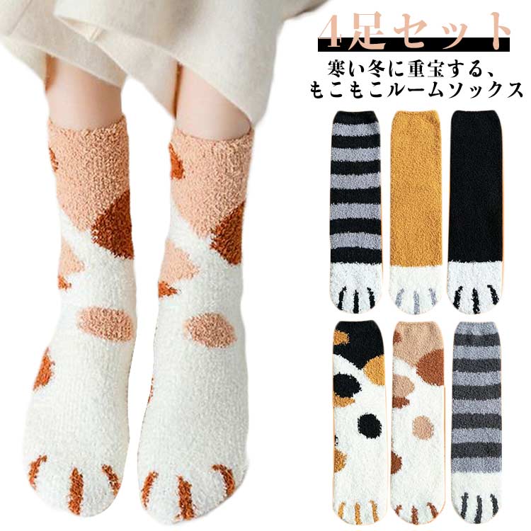 かわいい あったか靴下 もこもこ靴下 マシュマロタッチ 4足セット 猫爪 もこもこ レディース 寒さ・・・