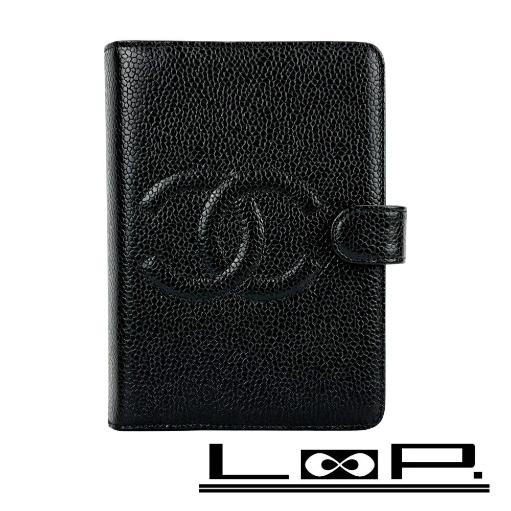 シャネル ■美品■ 手帳カバー 6穴 システム手帳 ココマーク キャビアスキン ブラック 箱 【56・・・