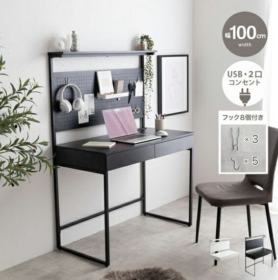 引き出し付きデスク有孔ボード 幅100cm コンセント付き USB付き ホワイト ブラック シンプル・・・