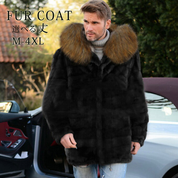 毛皮コート ファーコート メンズ アウター ロングコート ロング丈 フード付き 防寒 ファー フェイ・・・