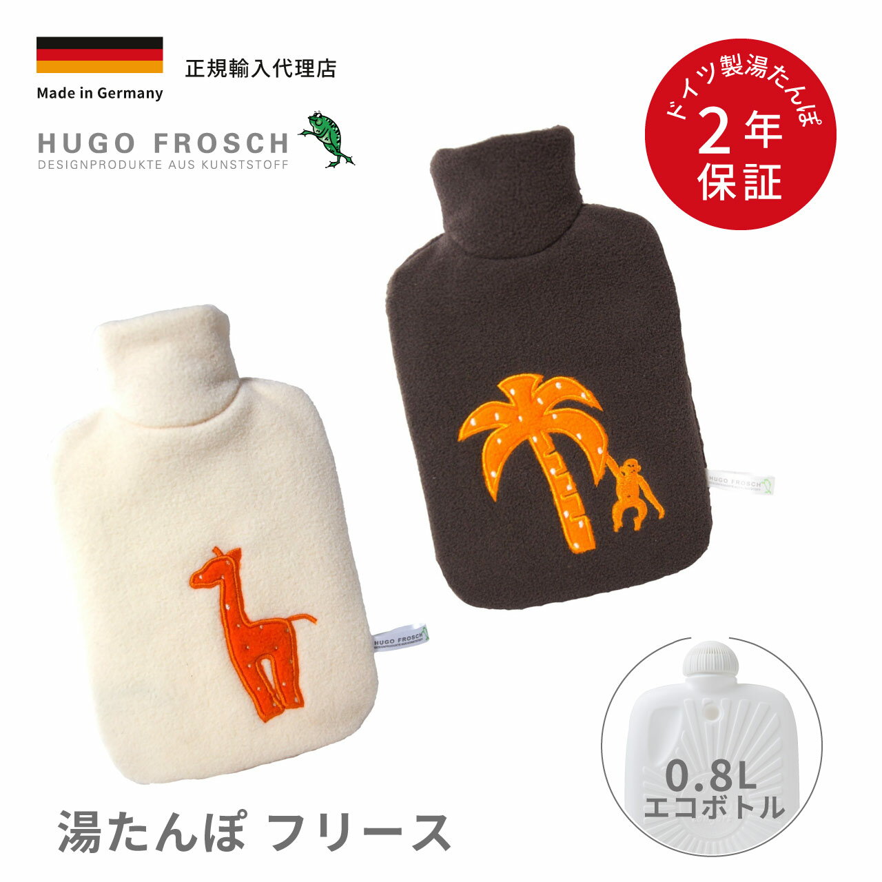 湯たんぽ 0.8L エコ ドイツ製 かわいい フリース 刺繍 キリン ヤシノキ 輸入総代理店 フーゴ・・・