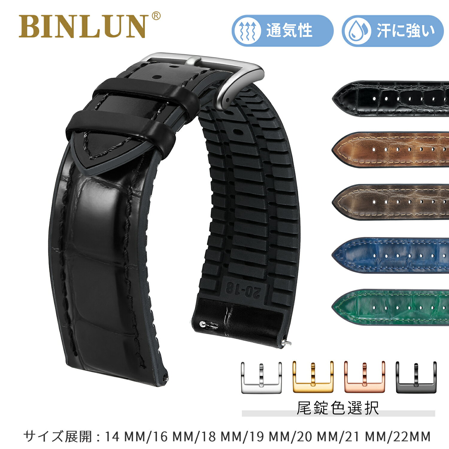 [BINLUN] 革 腕時計ベルト ワニ革模様 内側 シリコン 通気性 スマートウォッチバンド 時計・・・