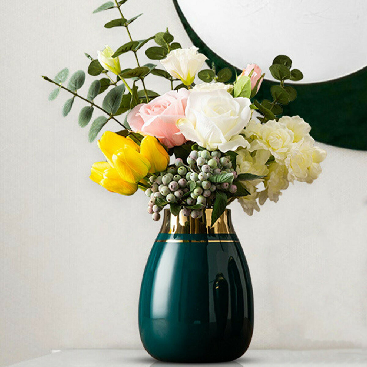 [中サイズ] VeroMan 花瓶 セラミック フラワーベース ダークグリーン 深緑 ゴールド 金 ・・・
