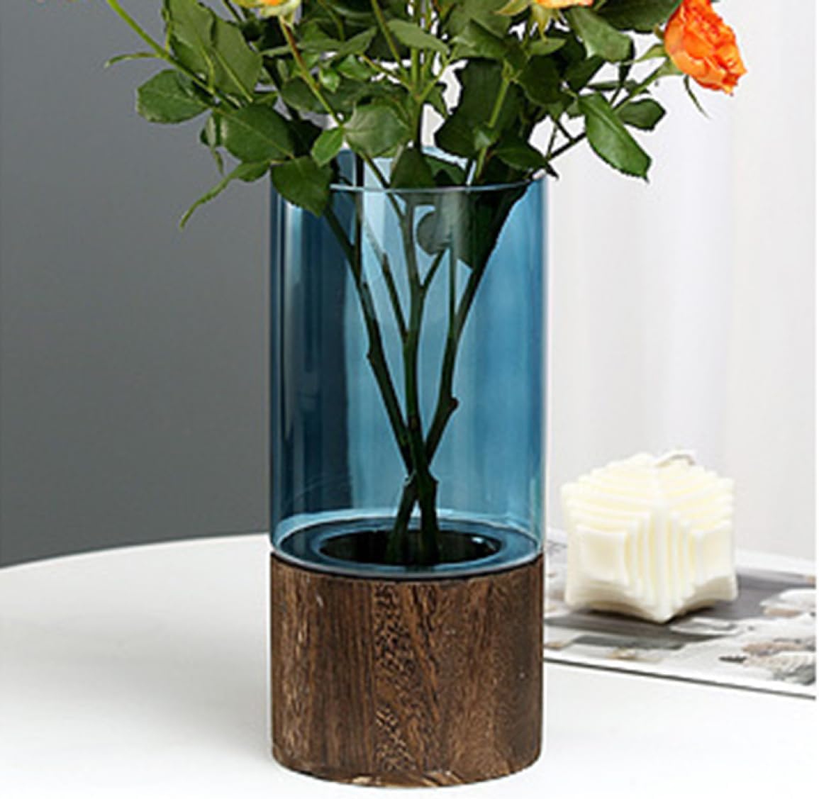 花瓶 大 フラワーベース ブルー ガラス 木製 北欧 透明 花器 シンプル クリア 北欧 透明 12・・・