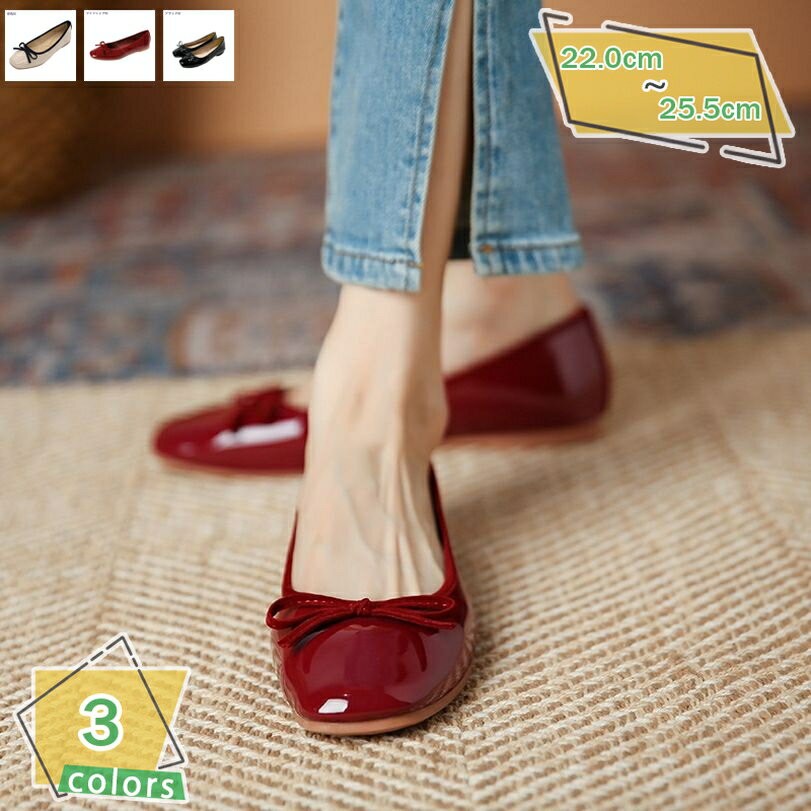 500円OFFクーポン レディース パンプス ぺたんこ スクエアトゥ リボン ローヒール エナメル ・・・