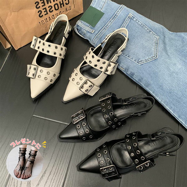 パンプス ローヒール レディース ぺたんこパンプス ポインテッドトゥ サンダル ストラップ ローファ・・・