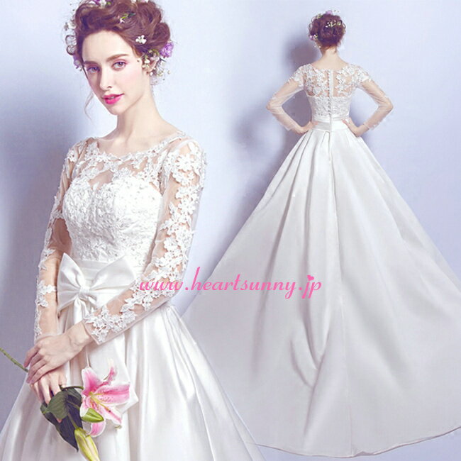 ウェディングドレス Aライン☆E059☆丸首透明レース長袖 蝶結びリボン ファスナー トレーン☆He・・・