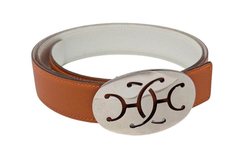 エルメス ベルト Hリフト キス バックル シルバー金具 ボックスカーフ トゴ オレンジ 白 型押し・・・