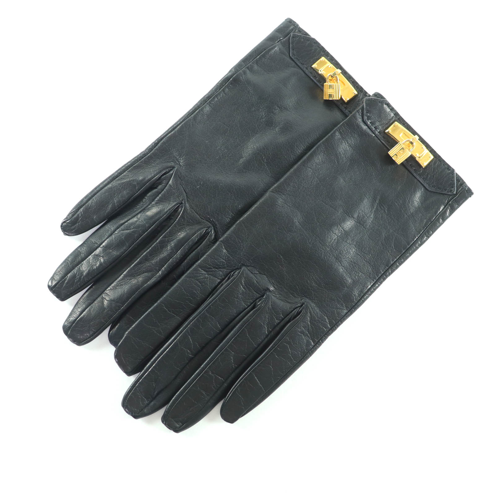 美品★HERMES エルメス ゴールド金具 ケリーバックル レザー グローブ 手袋 ブラック 7.5・・・
