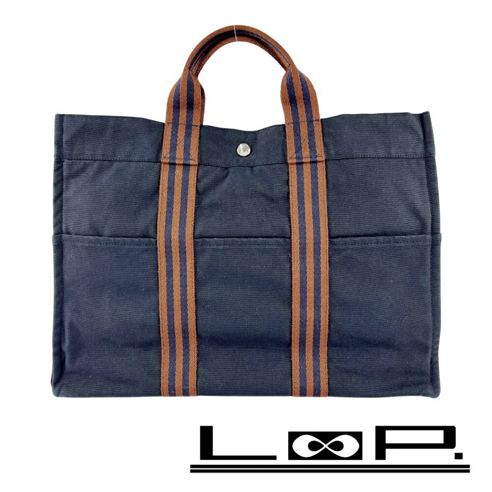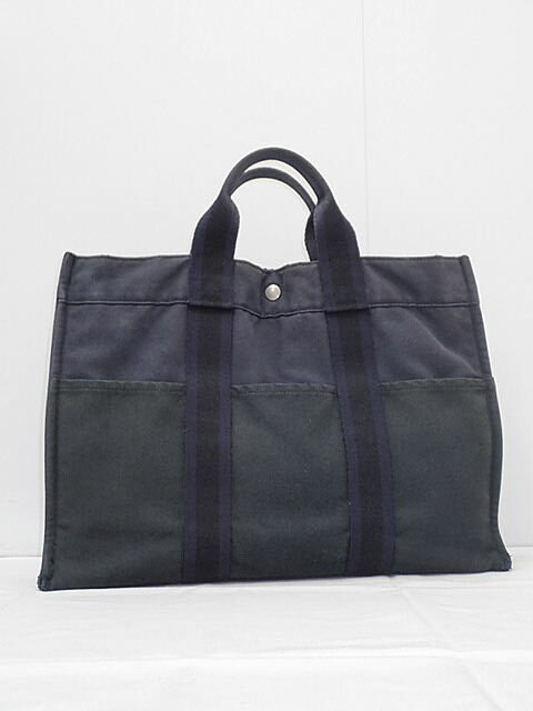 ■中古■ エルメス フールトゥ MM トート バッグ キャンバス ネイビー ブラウン 【448539・・・