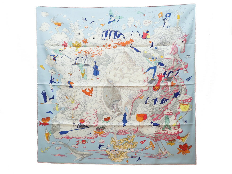 エルメス シルク100% ブルーグラシエ×グリス Sur Mon Nuage(私の雲) カレ90 ス・・・