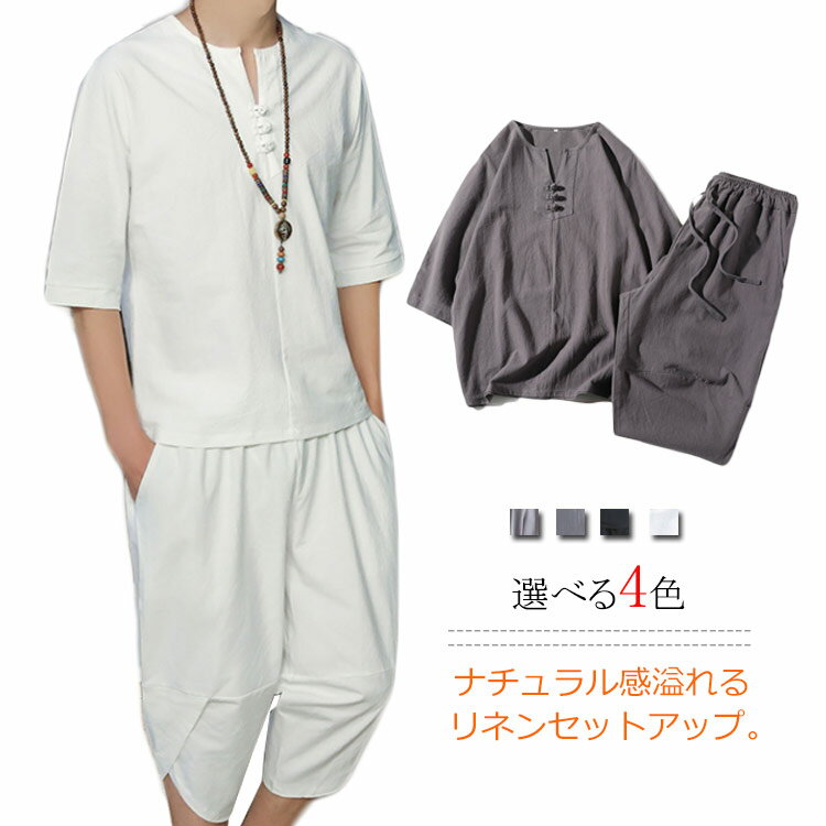 送料無料 全4色 綿麻 セットアップ メンズ リネン 7分丈 半袖 リネンシャツ カットソー カジュ・・・