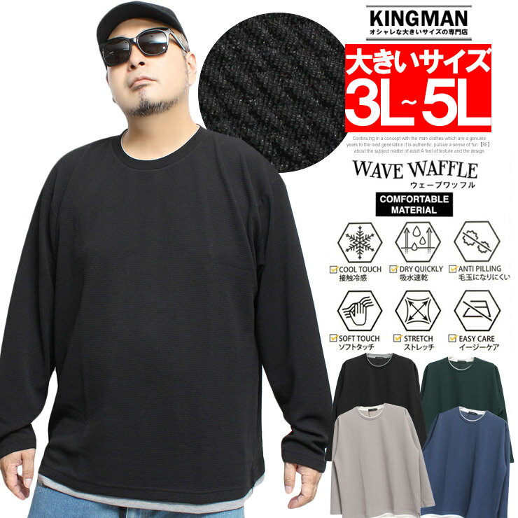 長袖 Tシャツ メンズ 大きいサイズ ウェーブワッフル フェイクレイヤード クルーネック カットソー・・・