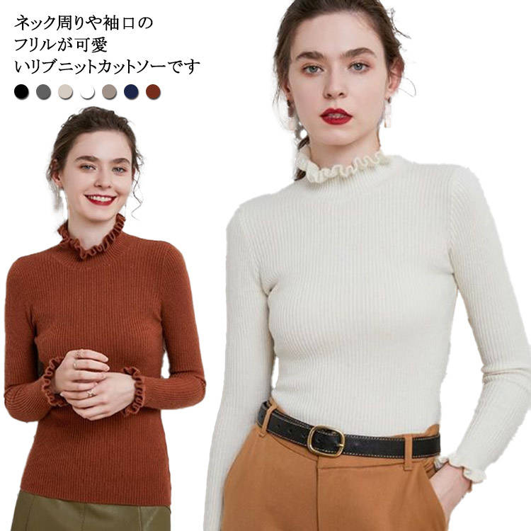 ニット カットソー リブニット プルオーバー トップス ニットセーター 長袖 ハイネック 襟フリル ・・・