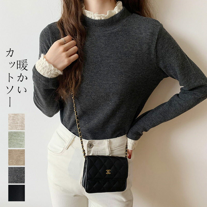 tシャツ カットソー 長袖 レディース トップス 秋 冬 インナー Tシャツ ハイネック フリル 襟・・・