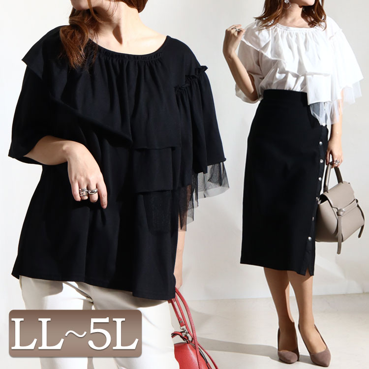 大きいサイズ レディース トップス カットソー アシメフリル異素材カットソー 半袖トップス 5分袖 ・・・