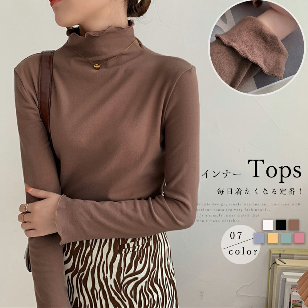 カットソー レディース 春秋冬 長袖 ハイネック 首元と袖口フリル インナー ポリエステル シンプル・・・
