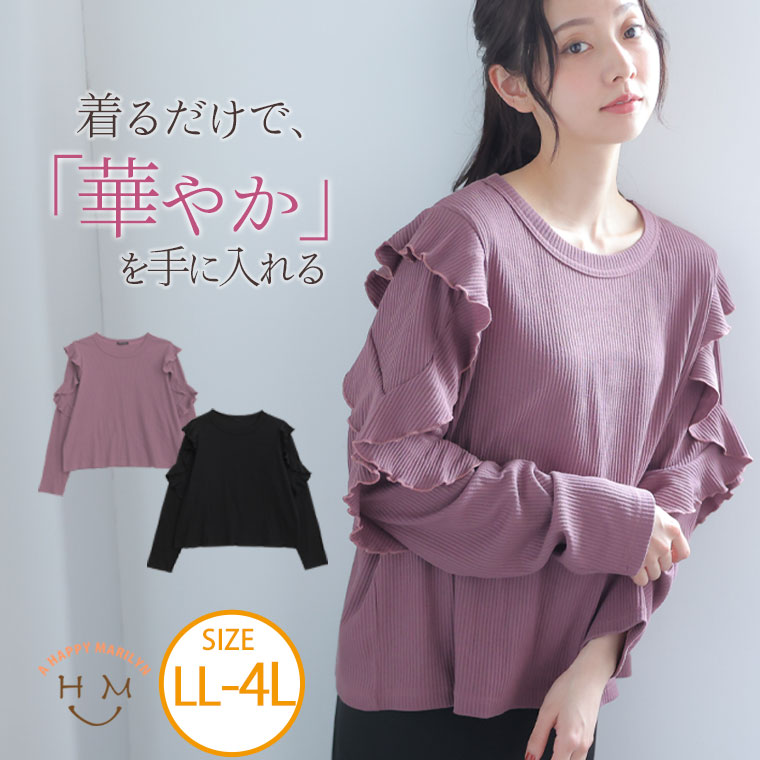 大きいサイズレディース トップス | 肩フリル テレコリブ トップス _ カットソー プルオーバー ・・・