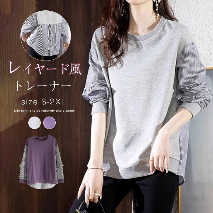 カットソー レディース 切替 ブラウス ストラップ チュニック クルーネック 長袖 トップス 配色 ・・・