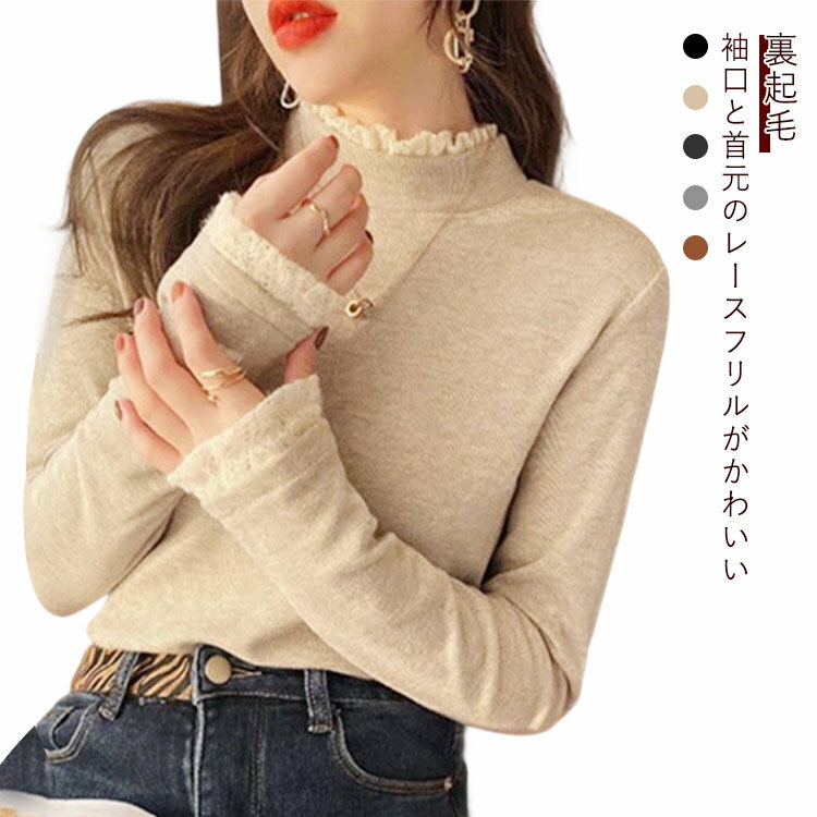 裏起毛 カットソー 重ね着風 ハイネック レースフリル 可愛い レイヤード 長袖 トップス インナー・・・