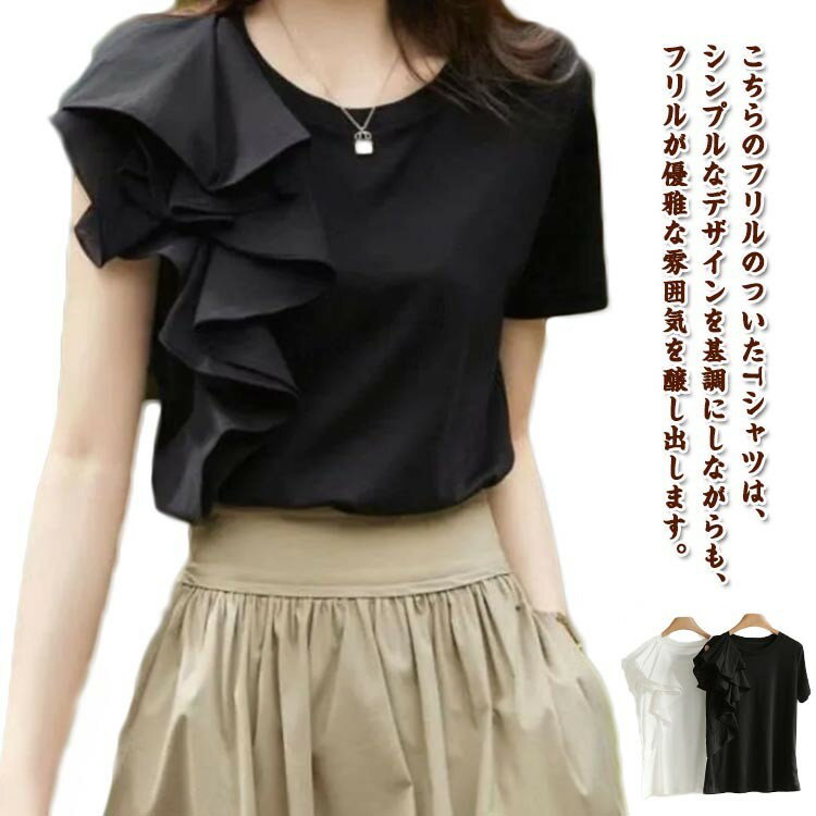 フリル ブラウス レディース カットソー 春夏 トップス プルオーバー 半袖 半袖Tシャツ スリム ・・・