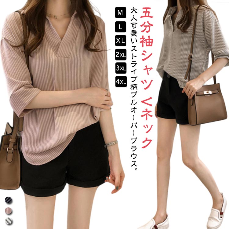 7分袖 5分袖 ブラウス 五分袖シャツ レディース ストライプ柄 トップス おしゃれ きれいめ プル・・・