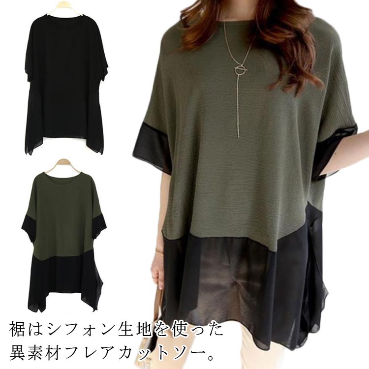 異素材切り替え Tシャツ シャツ ラウンドネック カットソー Tシャツ レディース 夏新作 フレア ・・・