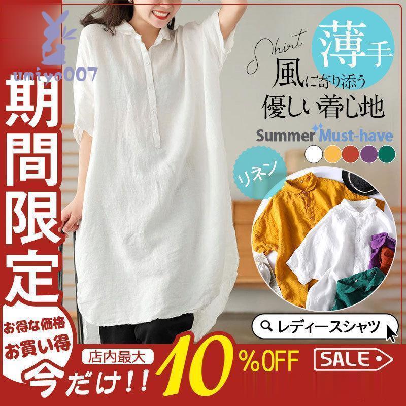 シャツ レディース ロング 半袖 ブラウス リネン Tシャツ ロングシャツ 春 夏 春服 夏服 きれ・・・