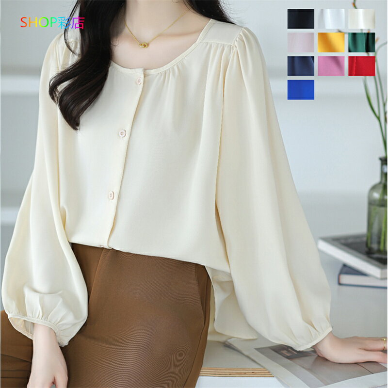 シャツ ブラウス レディース 長袖 バルーン袖 襟なし ノーカラー ブラウス トップス 無地 前開き・・・