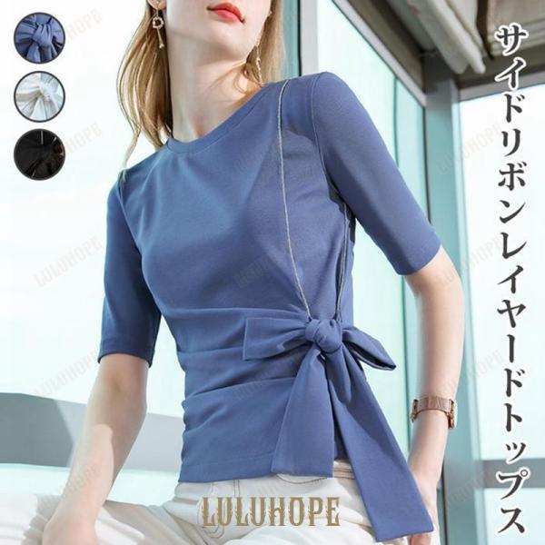 サイドリボン半袖Tシャツ トップス レディース Tシャツ 半袖 五分袖 カジュアル おしゃれ 可愛い・・・