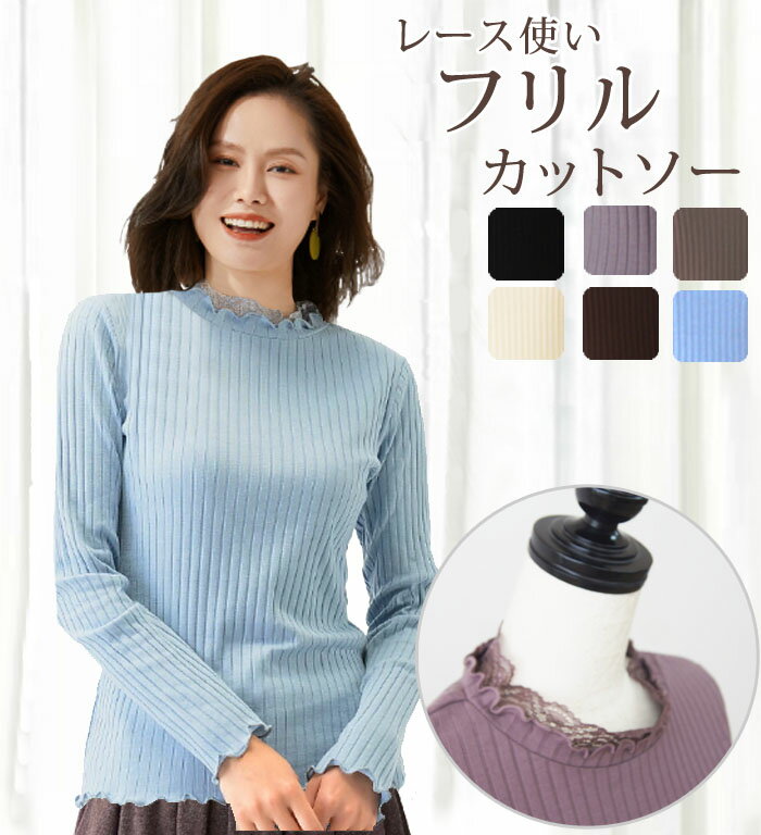 レディース 長袖 カットソー Tシャツ ロンT レース フリル レース ハイネック きれいめ 綿 コ・・・