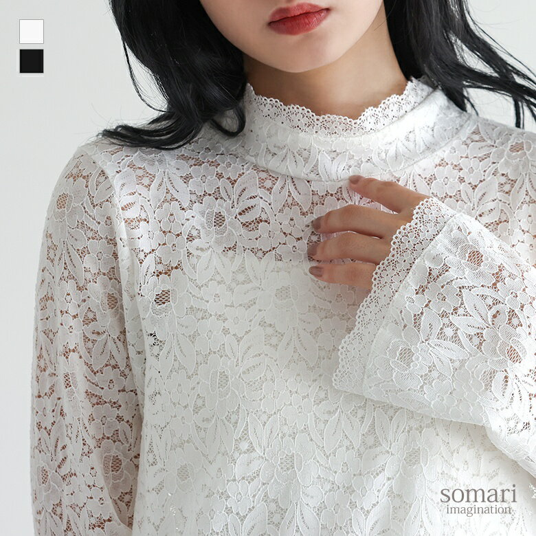 レースカットソー 長袖 レディース トップス ロンT インナー ハイネック 袖フレア 伸縮性 花柄 ・・・