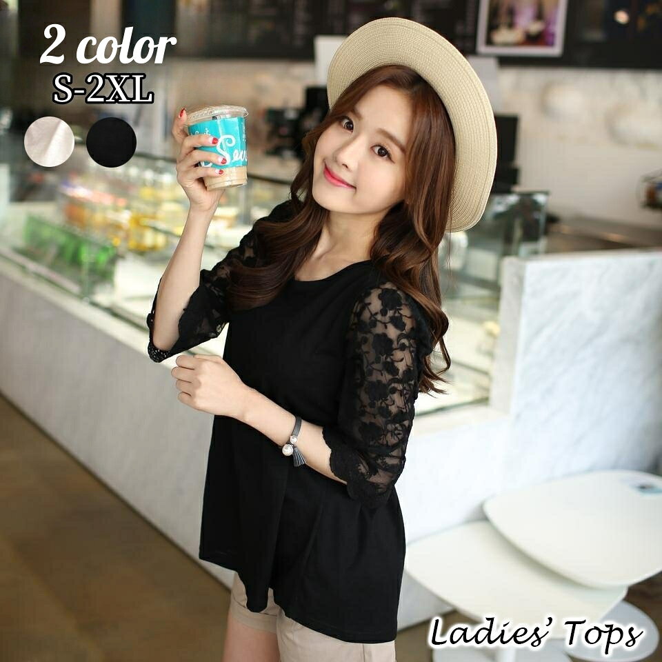 送料無料 カットソー レディース 7分袖 レース袖 ラウンドネック トップス 大きいサイズ有 単色 ・・・