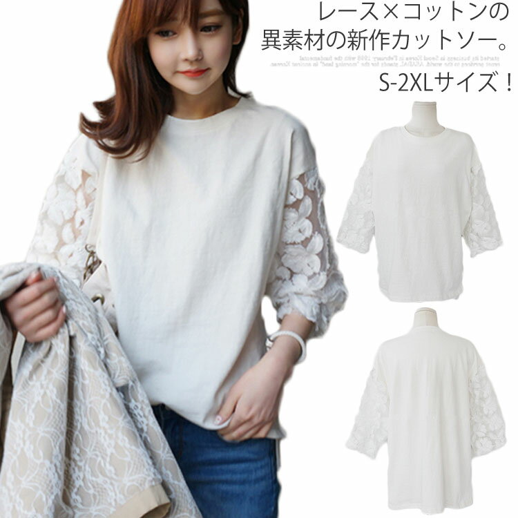 チュニック レース袖 レディース Tシャツ 切替ブラウス 七分袖 カットソー バックフレア プルオー・・・